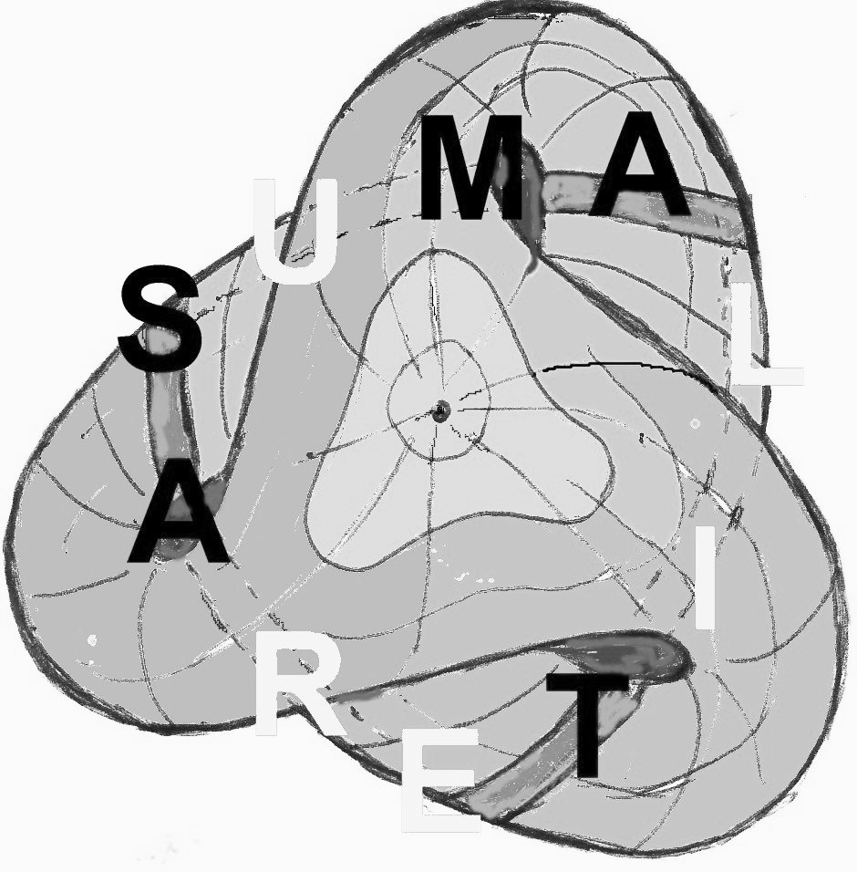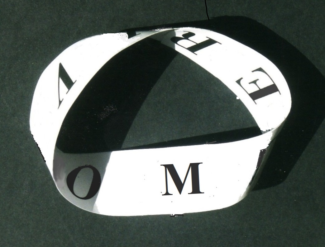 Bei der Meditation wird er nämlich nicht nur mit den räumlichen Besonderheiten konfrontiert sein (imaginär, bildhaft, topologisch), sondern auch mit der Sprache (symbolisch, worthaft, typographisch). Provoziert er mit den rein gedanklich meditierten Formel-Worten diesen unbewussten hyperspärischen Raum, wird dieser ebensolche Pass-Worte oder wie Lacan sagt ‚ultrareduzierte Phrasen‘, wahrnehmbare, hörbare, erfahrbare unbewusst gewesene Gedanken herausgeben. Die auf ein topologisches Band (Möbiusband rechts) bzw. Boysche Fläche (links) geschriebenen Buchstaben zeigen dies erneut.